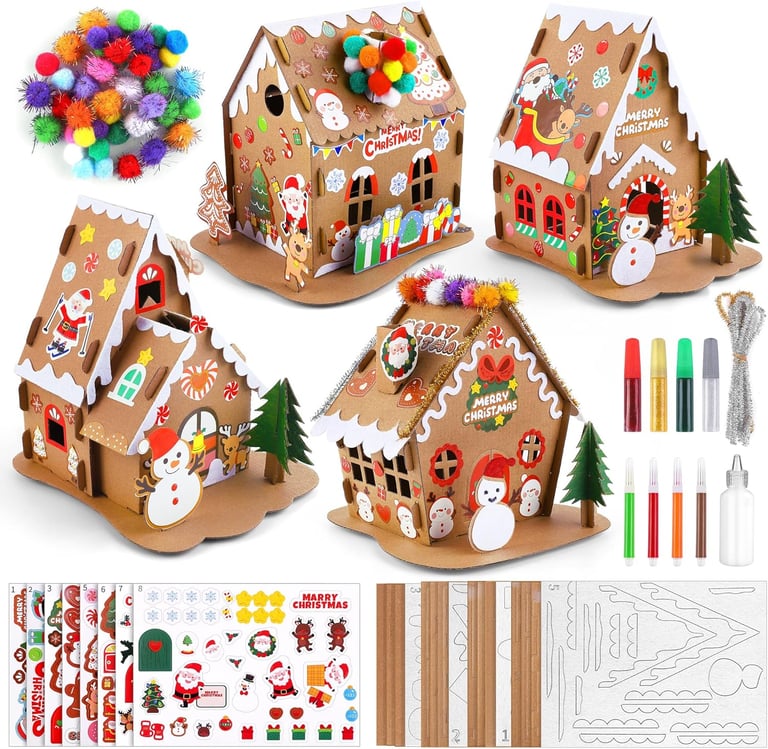 Let's end on a fun note. I ordered several of these gingerbread house kits for a church activity. We had groups compete to see who could make the most original, the funniest, etc... and it was a huge hit. These are not made from food. They are made from cardboard and they come with tons of stickers, and pompom balls for decoration. There are 4 different styles of house in each kit. They are pretty simple to put together. There's also some glitter and glue and a few colored markers. Might be a fun family night activity or something to keep the kids occupied at a holiday gathering. You get 4 houses PER kit and the cost is $17.99