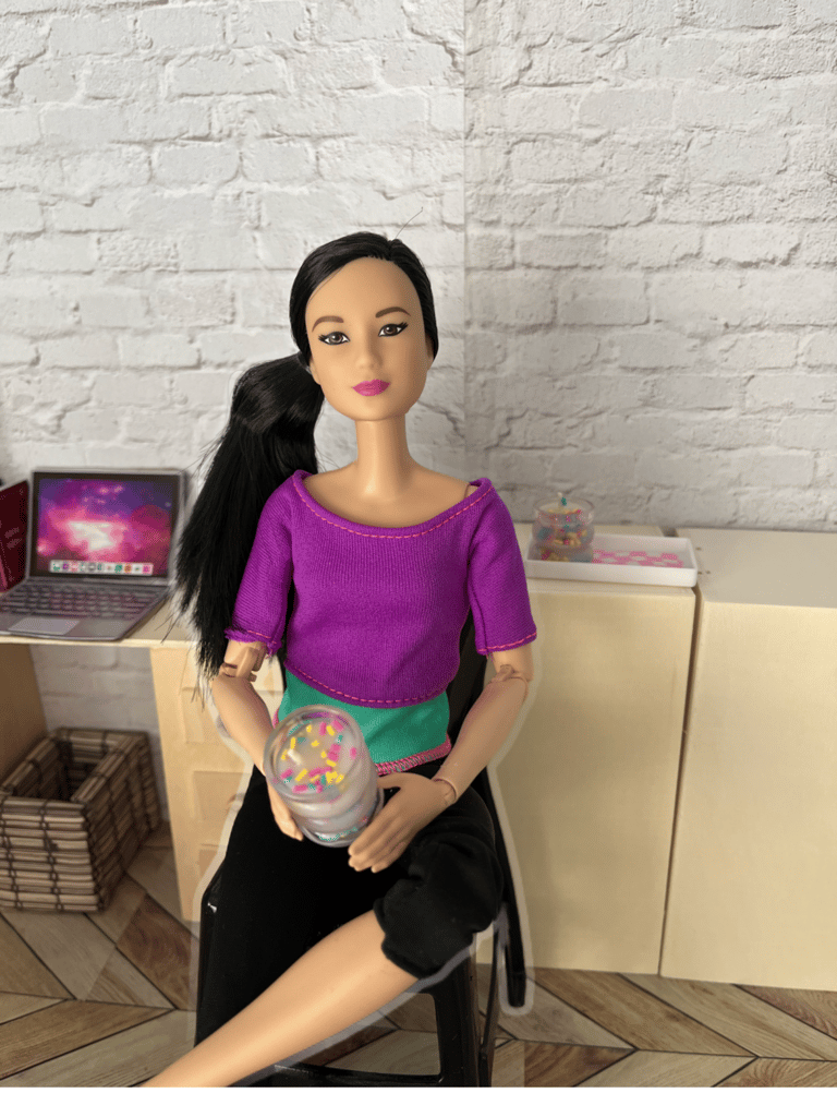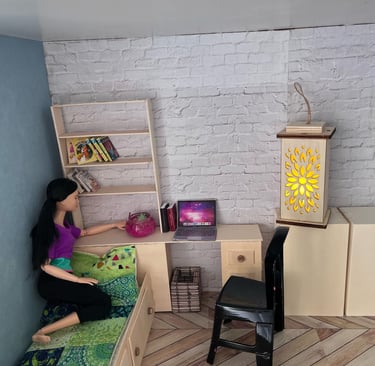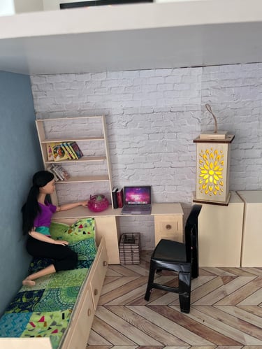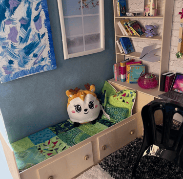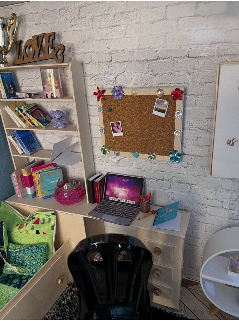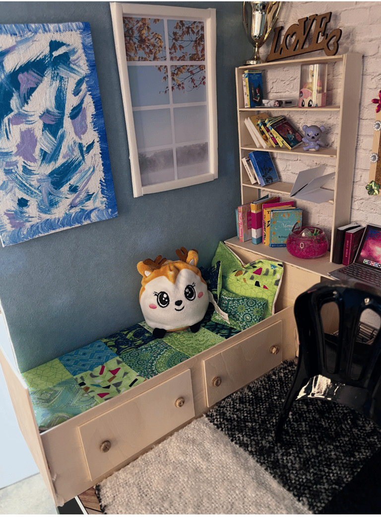 This was a fun dorm room vibe. I attached a bookshelf to the bed and put some books and a fish tank, a mini doll, and a LOVE sign from the dollar store on the shelves. I got that plushie somewhere, and thought it would be cute on the bed.