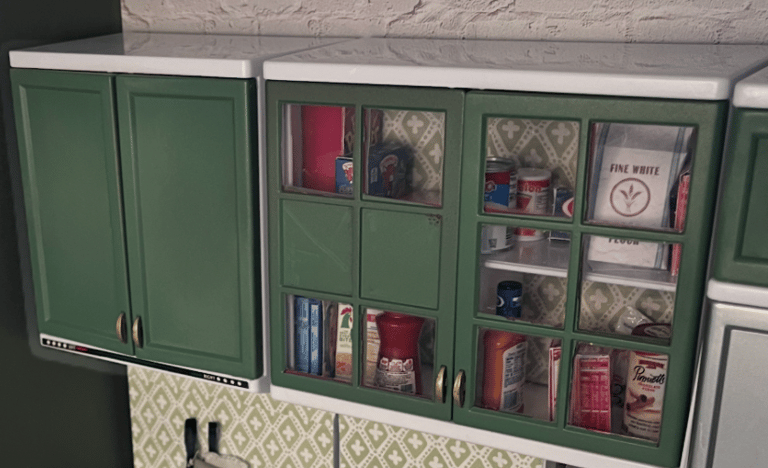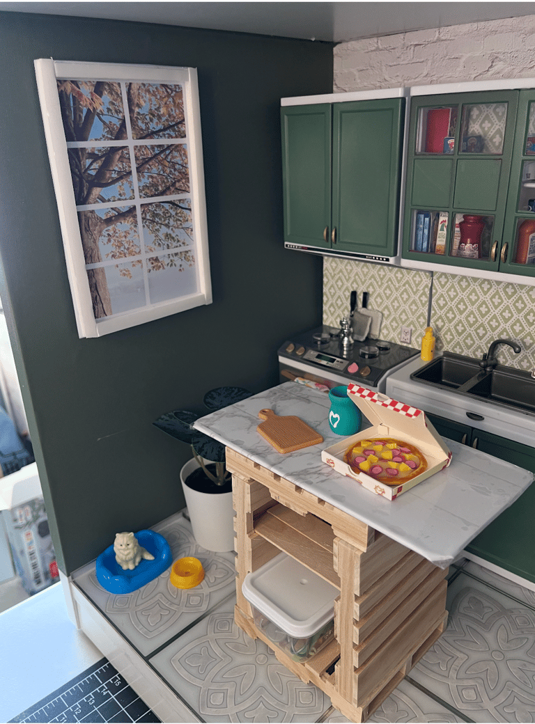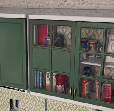 I love this green kitchen. We took the pink Barbie kitchen and spray painted by following the video of Poppy Seed Mini. This time I did put food inside of the cupboards. The pizza was from those mini balls.