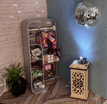 I repurposed the ball that all the mini brands things come in by glueing that disco ball type stuff all around it. And I put a little light below it. It looked really cool in the dark. That pretty box the light is on, you have seen in other houses like the Sophia nursery. It is a light I got from the dollar store.