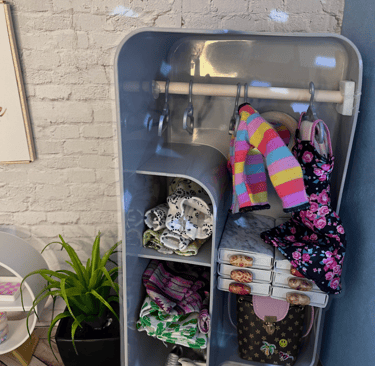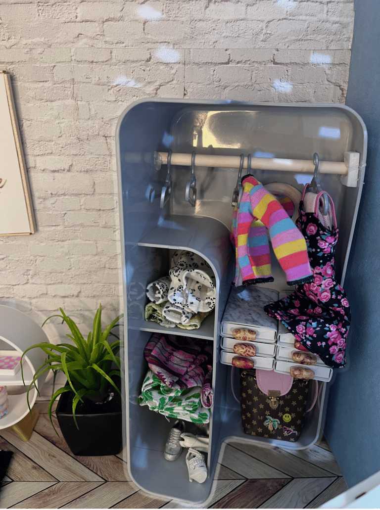 This is a beauty supply organizer but I thought it made a rad closet space. I made little drawers out of empty matchbook boxes with beads glued on the end. I cut a dowel rod and glued it across the top for a hanger.