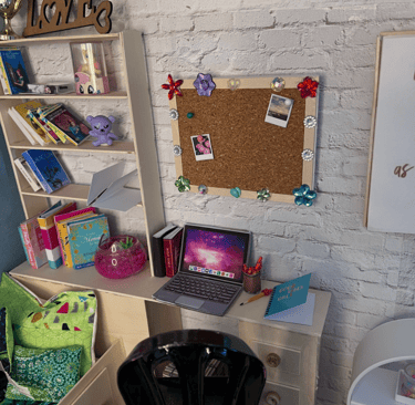 The bookshelf was also attached to a desk with fake drawers on the side. I found this cork board at the dollar store and turned it into a cork board with teeny tiny pictures stuck in it. I used real push pins but cut them short.