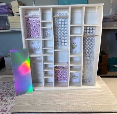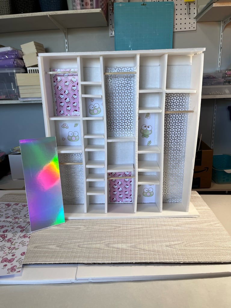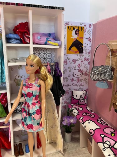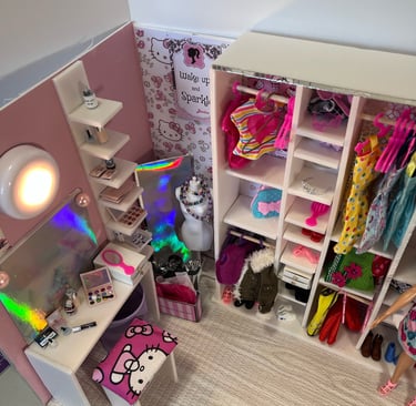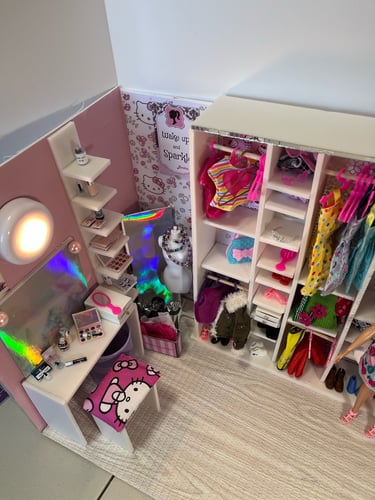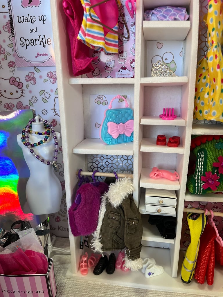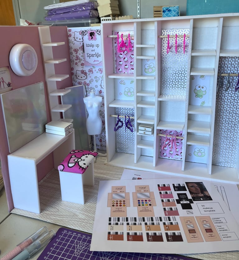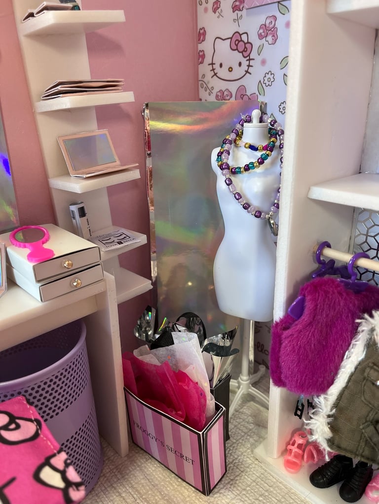 My granddaughter Airam LOVES Hello Kitty and Grandpa and I made this closet in her honor. We called it "The Aliyah" because Aliyah is her middle name. All shelving, desk, bench, etc was made from white foam board. I used the tri-fold poster board for the walls and floor. It's all a matter of a lot of cutting and gluing.