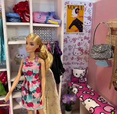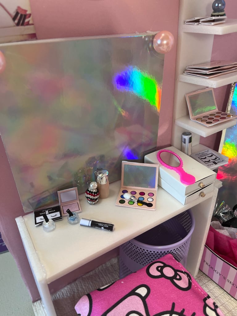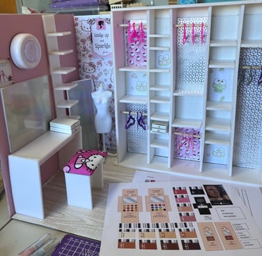 So at this point we have a floor and walls, the closet is glued to the back wall. And I was getting ready to make a bunch of teeny tiny make-up from My Froggy Stuff printables. She has a video on how to make the makeup also. You can watch that tutorial here. I was lucky enough to find Hello Kitty material at my local JoAnn's shop. I printed out all of the hello kitty wall paper from a Pinterest post. I loved the mannequin waiting in the corner. The mirror on the dressing table is just foam board with shiny cardstock. I wish I had done something better.