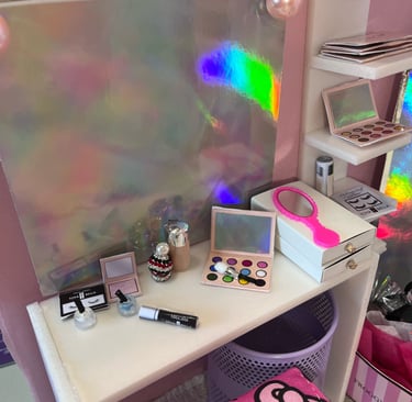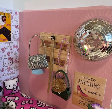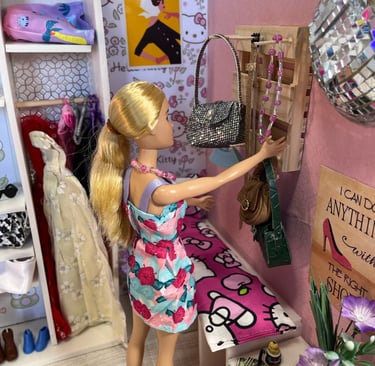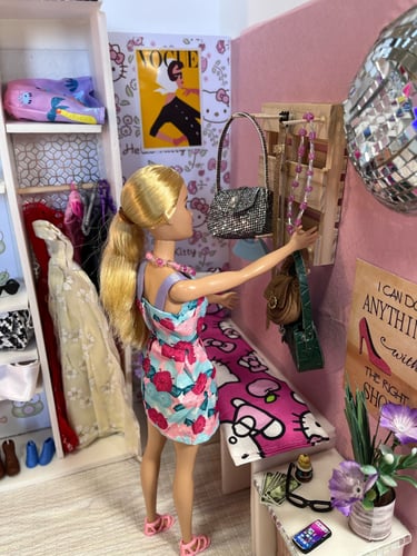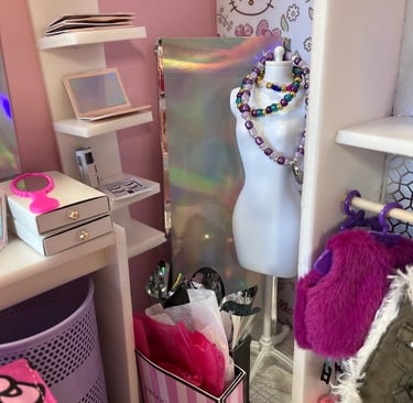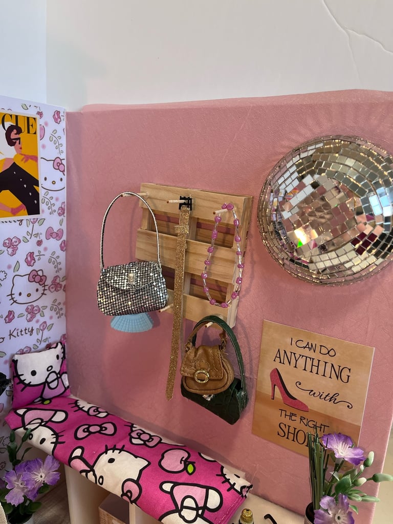 This is the right side of the room. I made a hanging board out of the mini pallets from the Dollar Tree. I covered half of a Mini Brands ball with disco ball type stick on mosaic tiles from Amazon. I also made that shiny purse! (I will address that in a separate blog post.) I made a little bench with Hello kitty fabric cushion and pillow. And just hung up some pictures I printed.